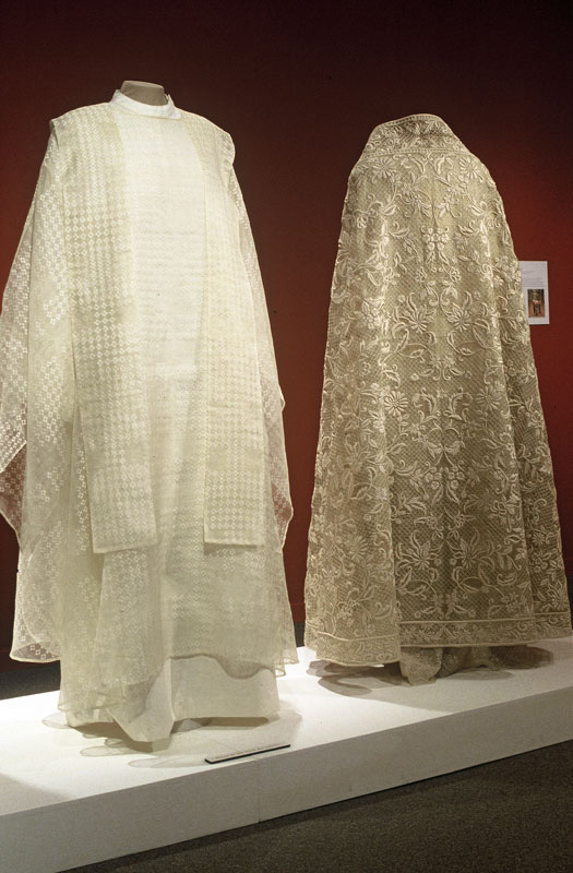 Historical garments from the Textile Museum’s collection: piña and abaca garments loaned from members of the local Philippine-Canadian community, as well as a collection of liturgical vestments designed by Benedictine monk and former fashion designer, Dom Martin de Jesus H. Gomez, OSB, of the Monastery of the Transfiguration in Bukidnon, southern Philippines.
